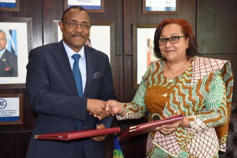 L-R: UN-ASG Mohamed Beavogui, Director-General, African Risk Capacity, and Dr. Stergomena L. Tax, Executive Secretary, Southern Africa Development Community (SADC) exchanging copies of the MoU at the SADC Secretariat, Gaborone, Botswana.